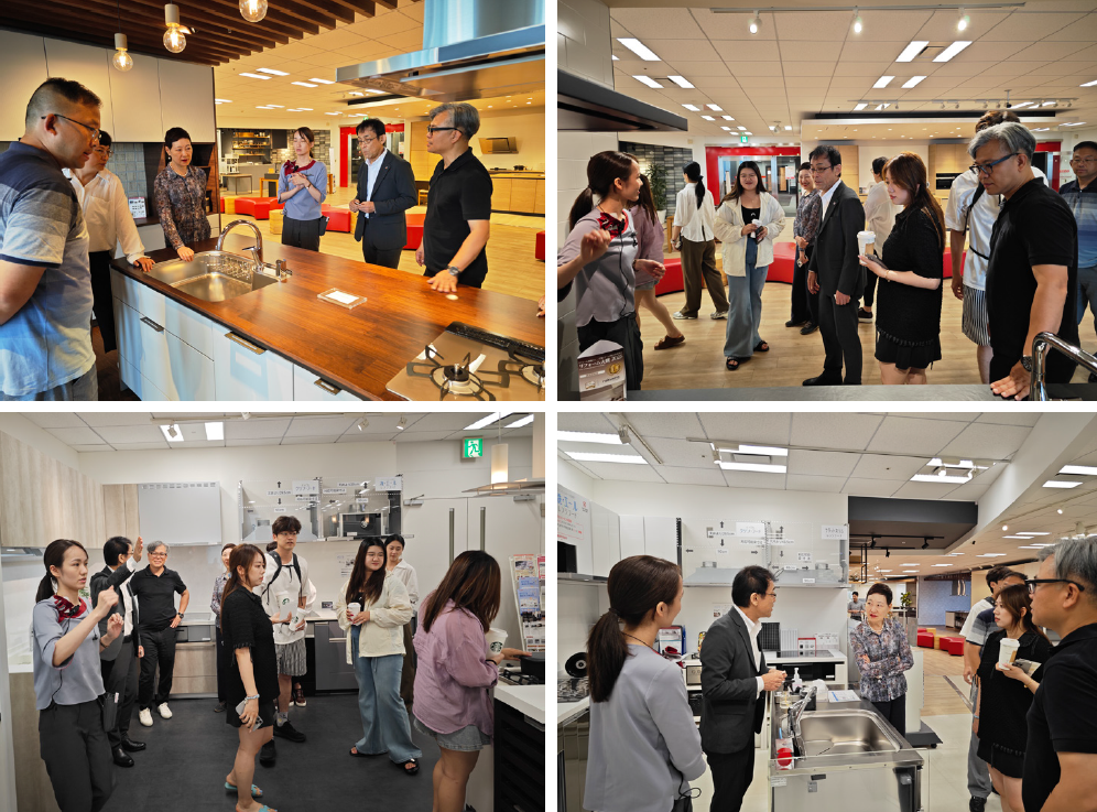 8月8日下午,考察团前往日本著名厨卫品牌——可丽娜厨卫有限公司。公司总经理小林宽茂亲自接待,并带领大家参观其产品展厅,详细介绍企业在不锈钢厨卫设备和整体厨房领域的设计理念、制造工艺与品质管控体系。