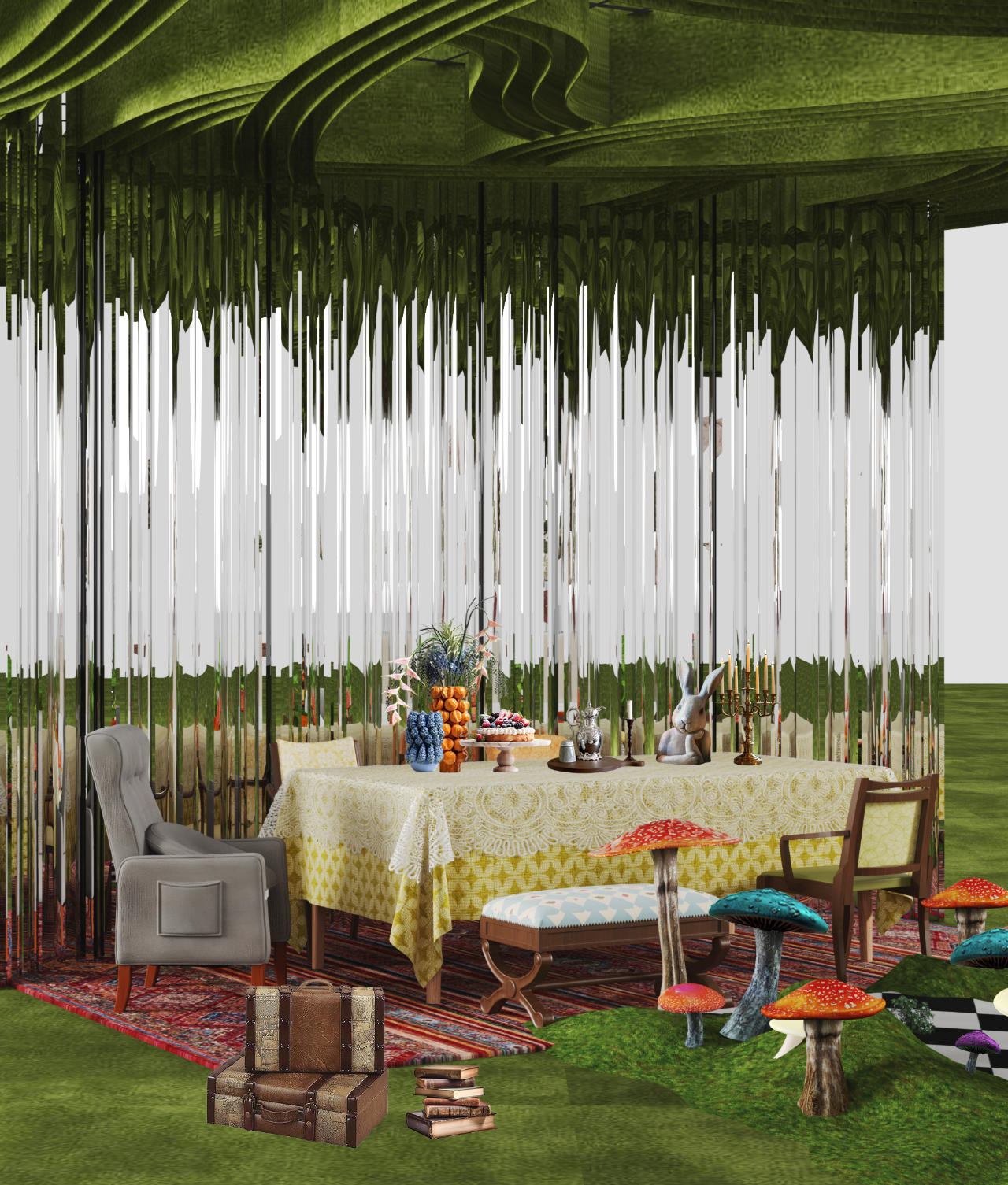 去年参与策展的设计师郑蒙丽和葛露佳,今年依然深度参与,除了联合PUMEI朴美和MAEATTI地球森林两家品牌联合打造了一场人与自然的故事特别展区外,她们还参与了由TEMPUR泰普尔和MLESUN美勒森品牌组成的适老主题展区与设计师陆子彧,李宣吉合作设计。适老展区的设计理念是通过戏剧化述说打破传统“适老”产品的固定想象。他们以逻辑与无逻辑的碰撞为主题,创造了一个类似爱丽丝梦游仙境。